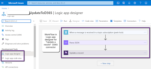 So the flow here is, from AX2012(send a message to) à Service bus queue(sends a message to)à Logic apps(uses D365 connector to update